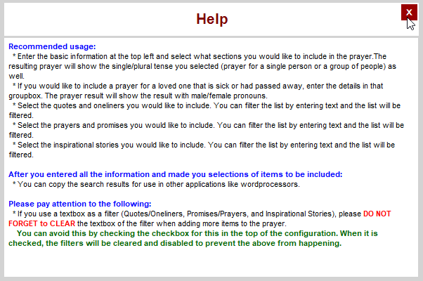 Dit proces creรซert een persoonlijke gebedsstructuur die traditionele gebedsvormen weerspiegelt (zoals ACTS: Aanbidding, Belijdenis, Dankzegging, Voorbede), terwijl het de gebruiker volledige flexibiliteit biedt om elk onderdeel aan te passen aan de eigen situatie.